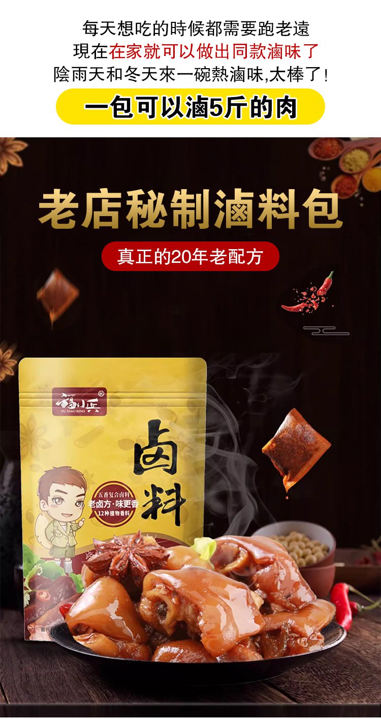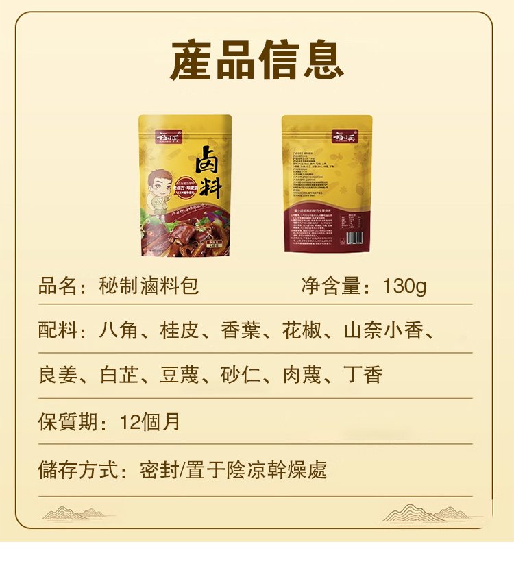 半小時前【限時搶購】秘製鹵料包 有了這個秘製滷料包,想吃什麼就滷什麼!百年老店獨家秘製配方,自己在家做,乾淨又衛生,味道比外面賣的還好吃~十八味秘制鹵肉料包 - 5包(50袋)NT$1198